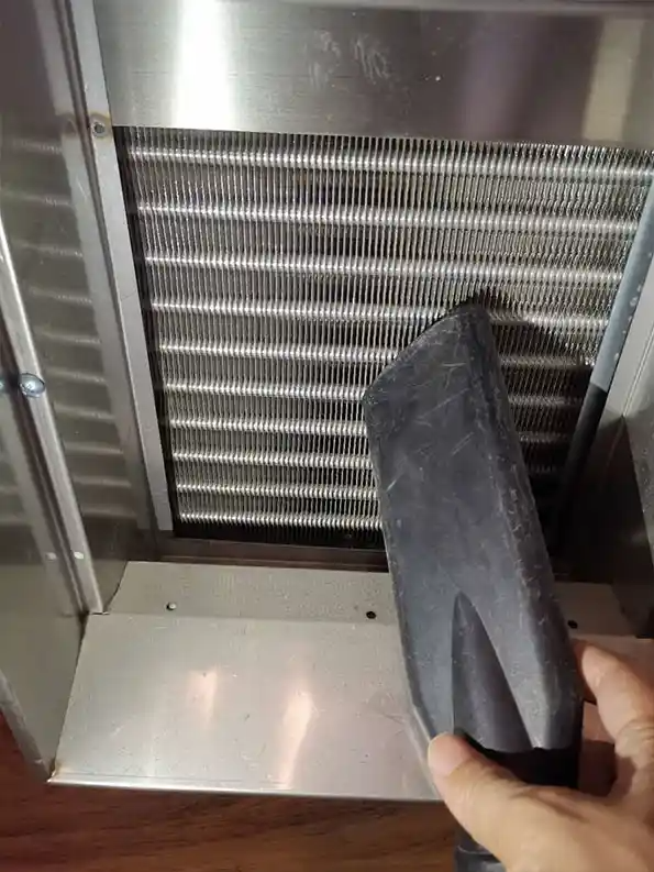 2. Use the crevice attachment of a vacuum cleaner to remove smaller particles. (Be careful not to bend the fins on the evaporator while doing so.)